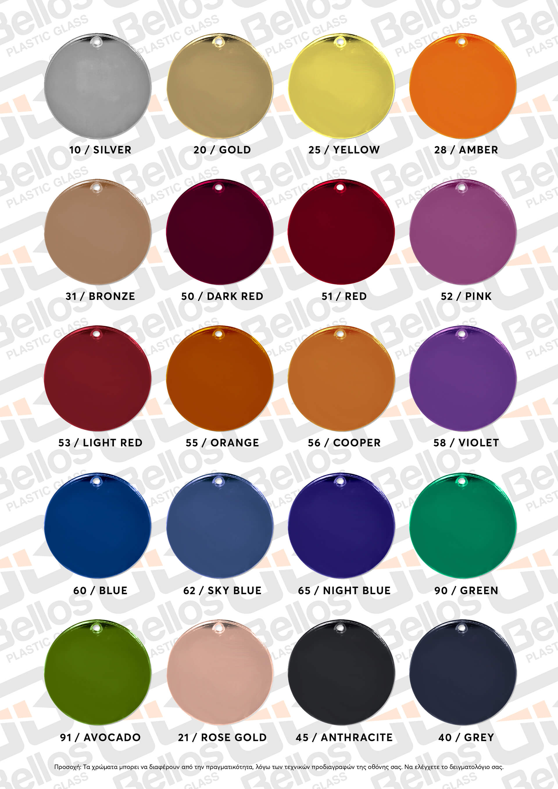 Υπάρχει μεγάλη ποικιλία από χρωματιστούς καθρέπτες σε διαστάσεις 2,05 x 3,05 mm, 2,05 x 1,52 mm, 1,02 x 3,05 mm, 2,05 x 1,01 mm με πάχη 2 έως 3 mm.